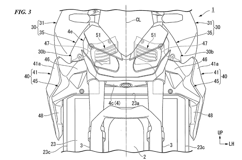 در واقع این پوششهای کرکرهای روی ورودیها هستند که کلید درخواست پتنت جدید هوندا هستند. در حالیکه داشتن ورودیهای هر دو طرف جلوی قاب، دسترسی راحت به ایرباکس را میدهد – و هوا میتواند توسط بدنه جانبی به سمت آنها هدایت شود – این قسمت از قاب به طور طبیعی روی یک شیب قرار میگیرد و با چنگک دوچرخه مطابقت دارد. بدون پوششهای کرکرهای روی ورودیها، کمی رو به بالا قرار میگیرند و اگر موتور زیر باران رها شود، به طور طبیعی آب داخل آنها میریزد. از آنجا، کانال میتواند باران را وارد فیلتر هوا کند، چیزی که هوندا میخواهد از آن جلوگیری کند. با بررسی نمونه اولیه CB1000 Hornet که هوندا در EICMA نشان داد، ورودیها را میتوان در پشت سرپوش جلویی مشاهده نمود.