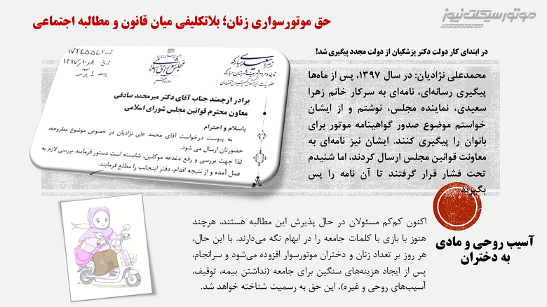 با تصمیم هیأت دولت، صدور گواهینامه موتورسیکلت برای بانوان با آموزش در آموزشگاههای مجاز و نظارت پلیس راهور به تصویب رسید و جزئیات فنی متعاقباً اعلام میشود.